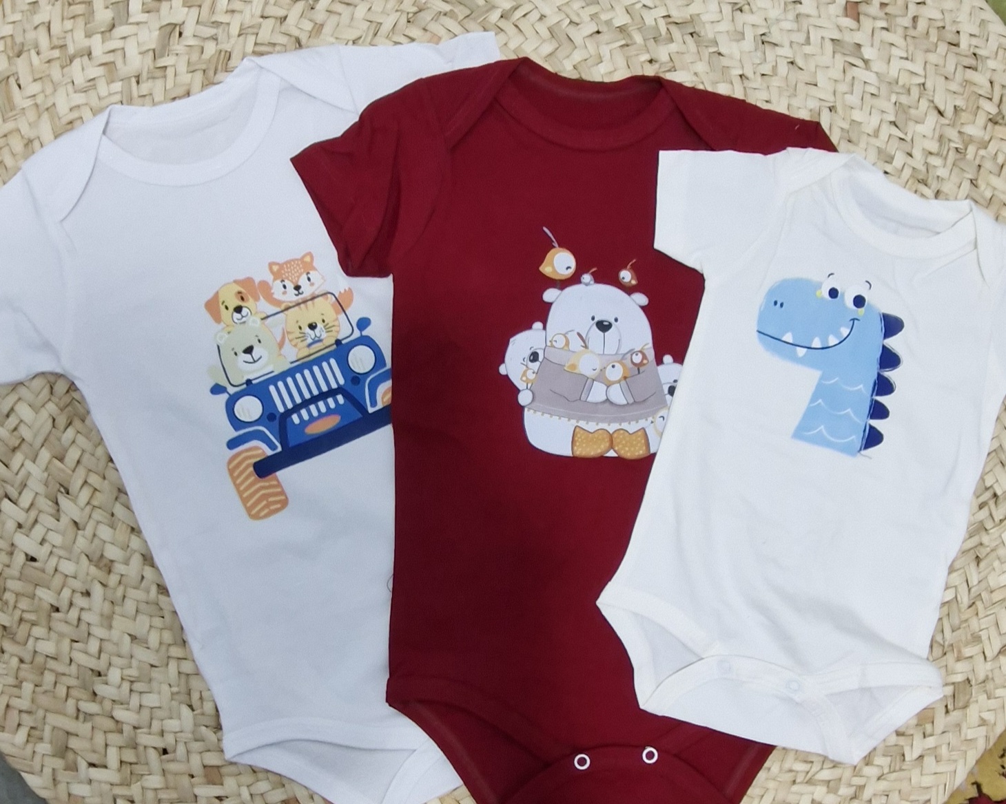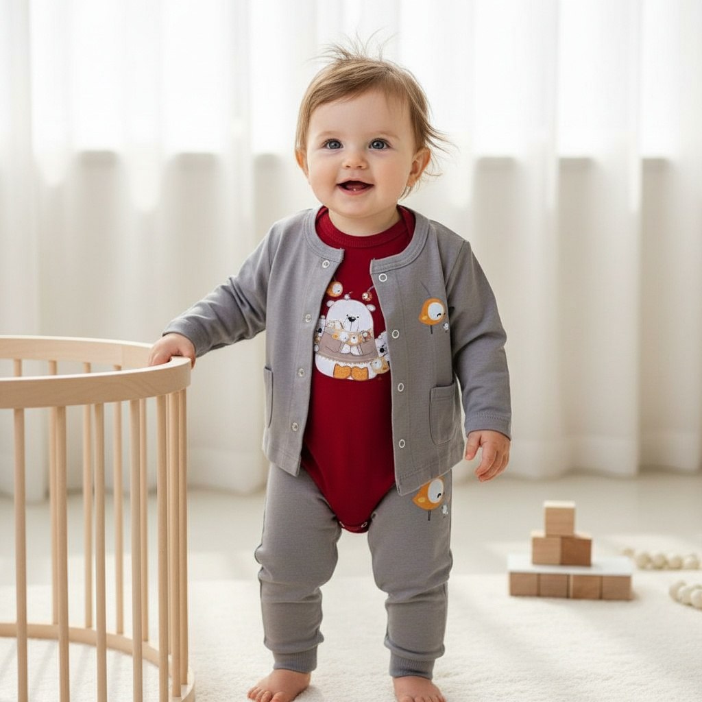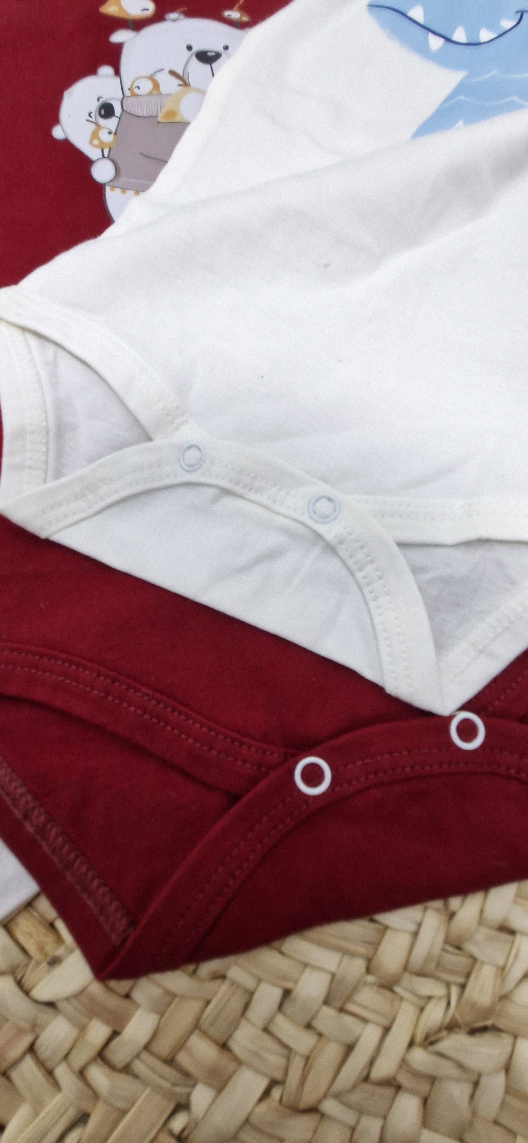 سه تکه های نقلی جنس نخ صد درصد پنبه شامل بلوز، شلوار و زیر دکمه در سایز های مختلف. یک تا دو سانت خطای اندازه گیری در نظر بگیرید. برای انتخاب سایز سانت ها حتما با لباس کودک مقایسه شود (سن ذکر شده حدودی است،جثه ها و قواره ی کارها متفاوت است) .